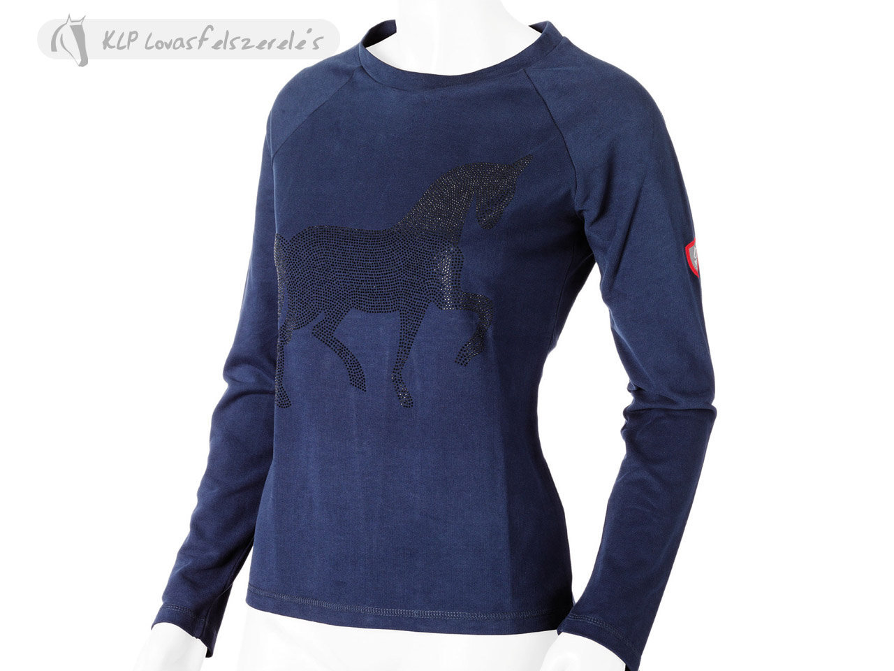 Hosszú (raglan) ujjú felső, mely puha és könnyű "french terry" pamutból készült. Középen különleges, ló alakot formázó strasszos nyomat, a bal vállon Tattini jelvény díszíti.